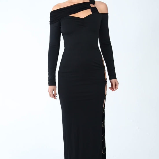 Expertly crafted from a sleek, figure-hugging fabric, this was made to turn heads. Designed with daring circular cut-outs along the leg, connected by statement bronze metal rings, this piece exudes confidence and modern glamour. The off-shoulder neckline and asymmetric straps flatter the décolletage while adding a bold edge. Pair yours with a sleek bun and strappy stilettos for a show-stopping evening look.