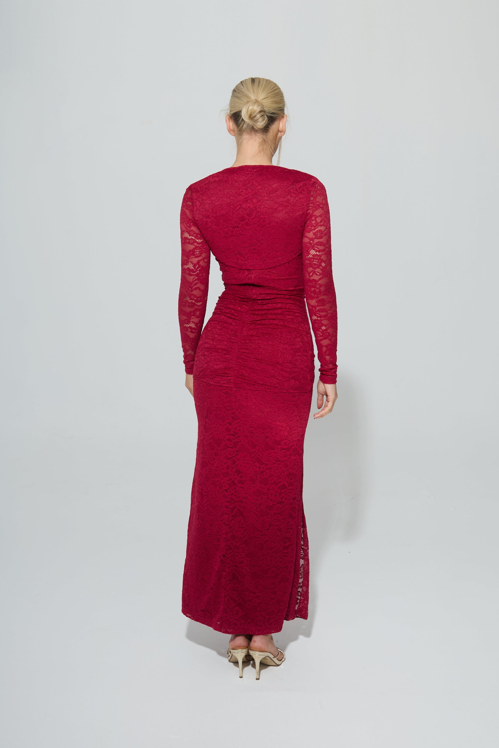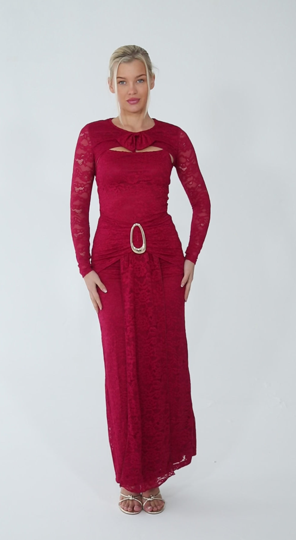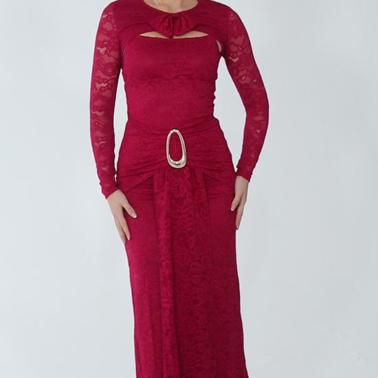 This elegant full-length gown is designed to make a refined statement with its sophisticated detailing and timeless silhouette. Crafted in a rich maroon lace fabric with a delicate floral texture, it features a high neckline with a stylish front cut-out, highlighted by a structured removable bow for a touch of femininity. The fitted bodice flows seamlessly into a cinched waist, enhanced by gathered draping and a sleek golden accent at the centre, creating a flattering shape. Perfect for evening occasions, galas, or formal events, this gown combines modern design with classic elegance for a truly captivating look.