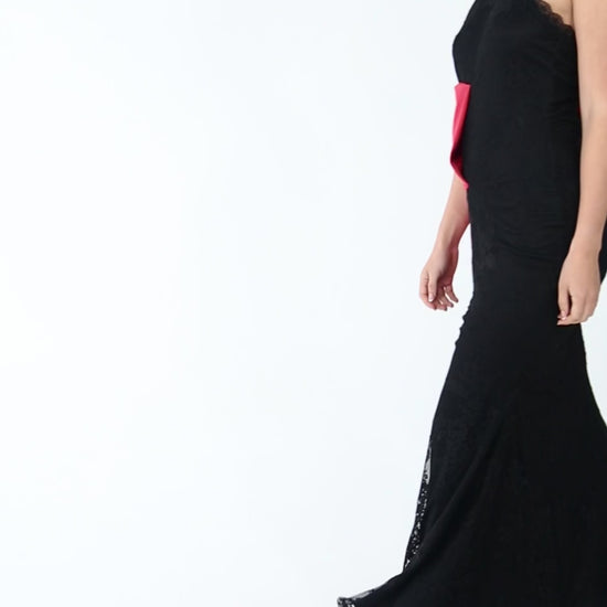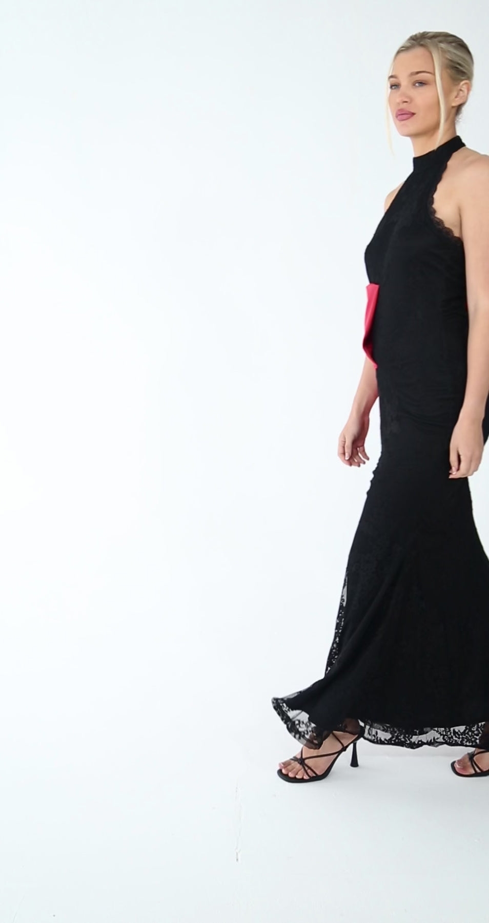 This gown is a striking full-length design that combines elegance with bold detailing. It is crafted from a black lace-like fabric. The silhouette is sleek and body-skimming, flaring slightly at the hem to elongate the figure. The neckline is high and halter-inspired, while the shoulders are exposed through cut-outs that lead into long, dettachable sleeves. The standout feature of the dress is a sculptural red accent at the waist: a dramatic bow-like structure with a circular cut-out that reveals a hint of skin, from which a long red panel cascades downward, adding asymmetry, colour contrast, and movement. This design balances classic sophistication with avant-garde flair, making it ideal for high-fashion events or red-carpet moments.
